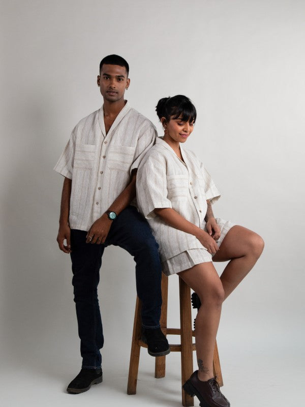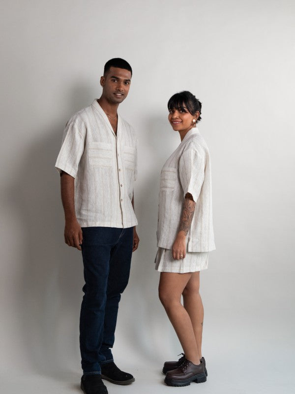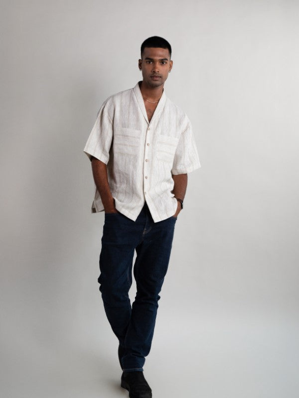 Product Description: Calm, clean, and quietly striking, the Conch Shirt is made for sun-drenched days. Crafted in breathable linen with soft vertical stripes. Its relaxed structure is balanced with a sleek shawl collar and wooden buttons, while dual patch pockets add a utilitarian charm.