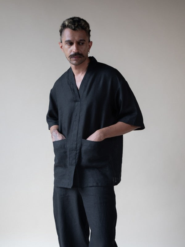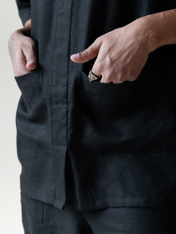 Product Description: The Drift Shirt is a relaxed fit tunic, with a Han-eri inspired neckline. It features two roomy front pockets and clean finishing in pure linen. The kind of piece that feels both nostalgic and modern.